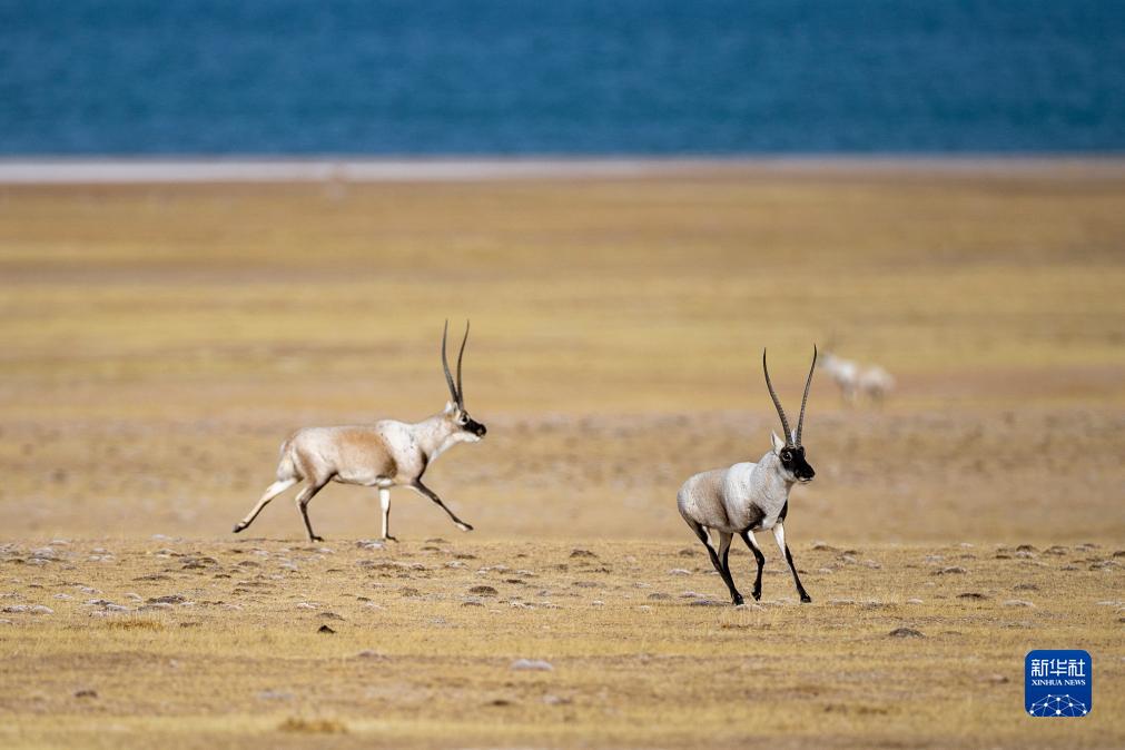 在羌塘国家级自然保护区,两只雄性藏羚羊为争夺交配权而相互追逐(12月16日摄)。