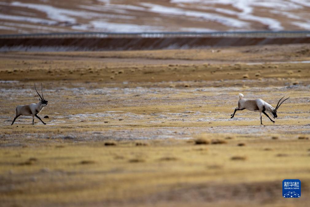 在羌塘国家级自然保护区,两只雄性藏羚羊为争夺交配权而相互追逐(12月16日摄)。