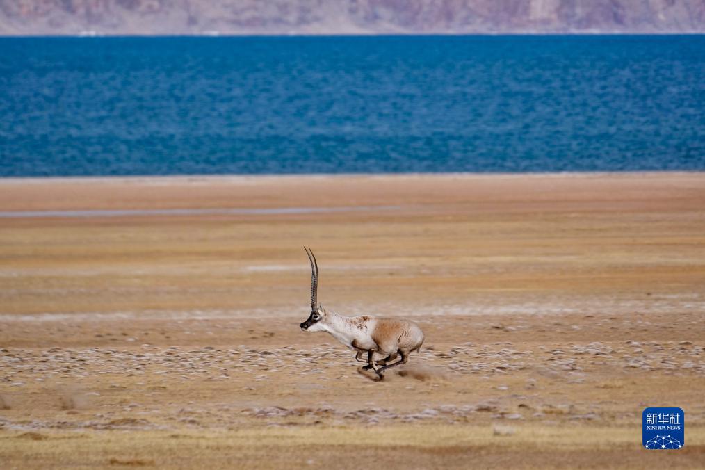 在羌塘国家级自然保护区,一只雄性藏羚羊在奔跑(12月16日摄)。