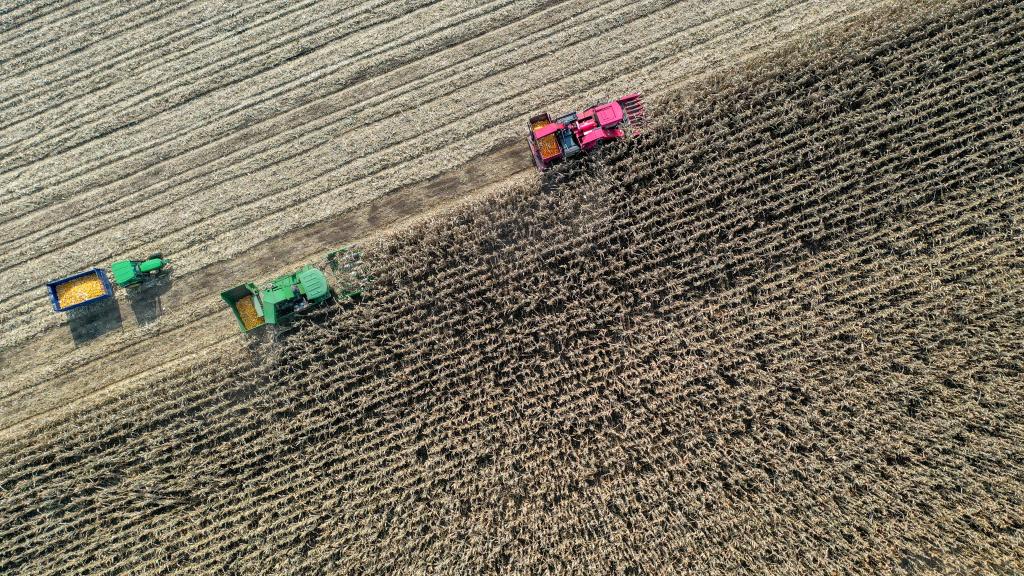 10月11日,在吉林省公主岭市,农民正在收获玉米。(新华社记者张楠摄)