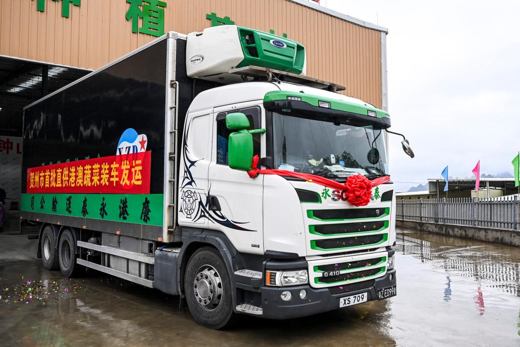 12月18日,在广西钟山县东融(供港)稻菜产业示范基地,载有蔬菜的货车发车驶往香港。新华社记者 曹祎铭 摄