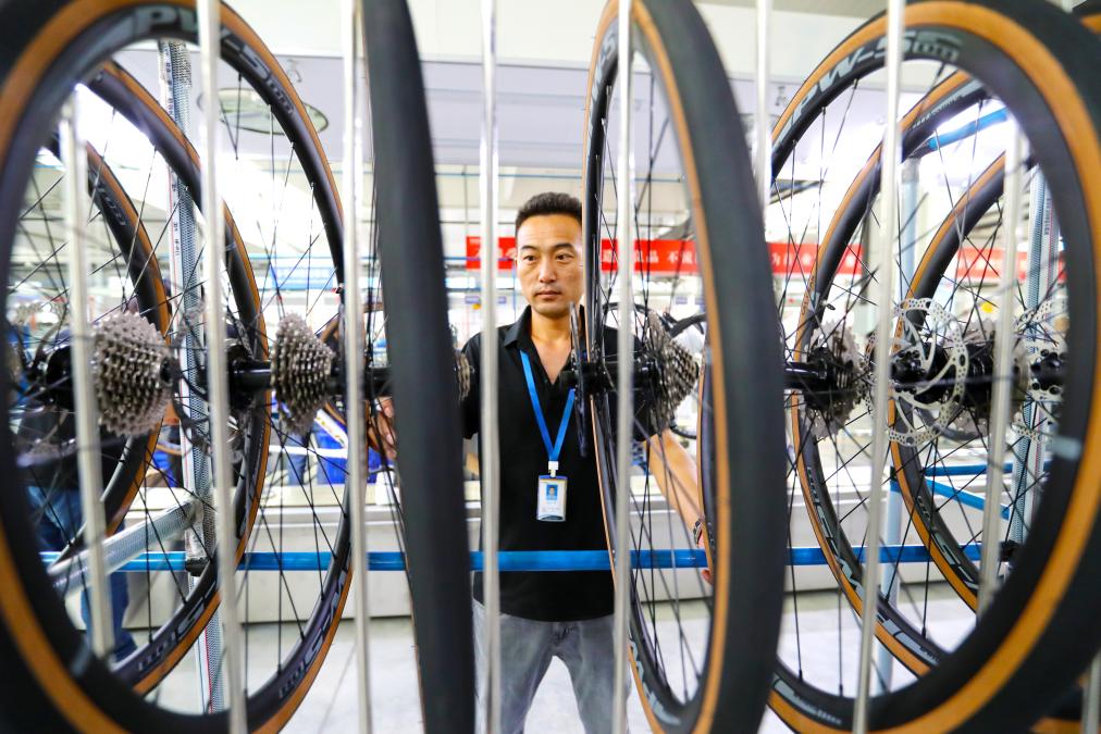 山东省乐陵市一家碳纤维自行车企业,工人在组装线备料。这批自行车将通过青岛自贸片区出口欧美、东南亚等国家和地区(9月9日摄)。