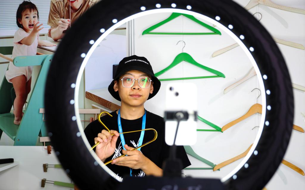 青岛自贸片区由工业厂房改造而成的写字楼里,创业者陈一鸣通过网上直播销售商品(9月22日摄)。