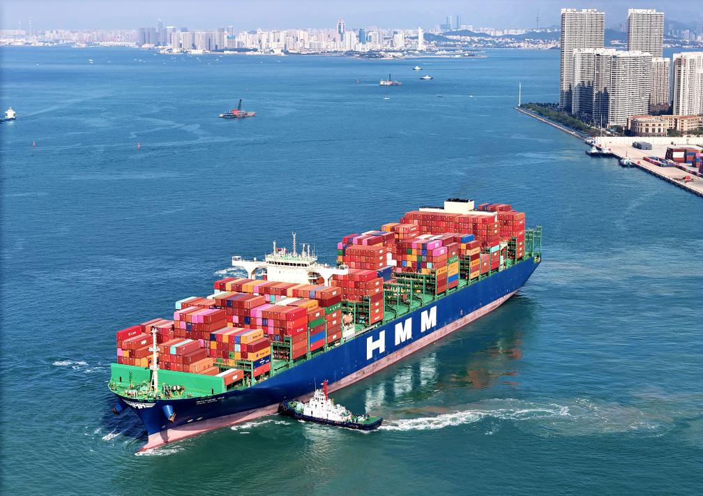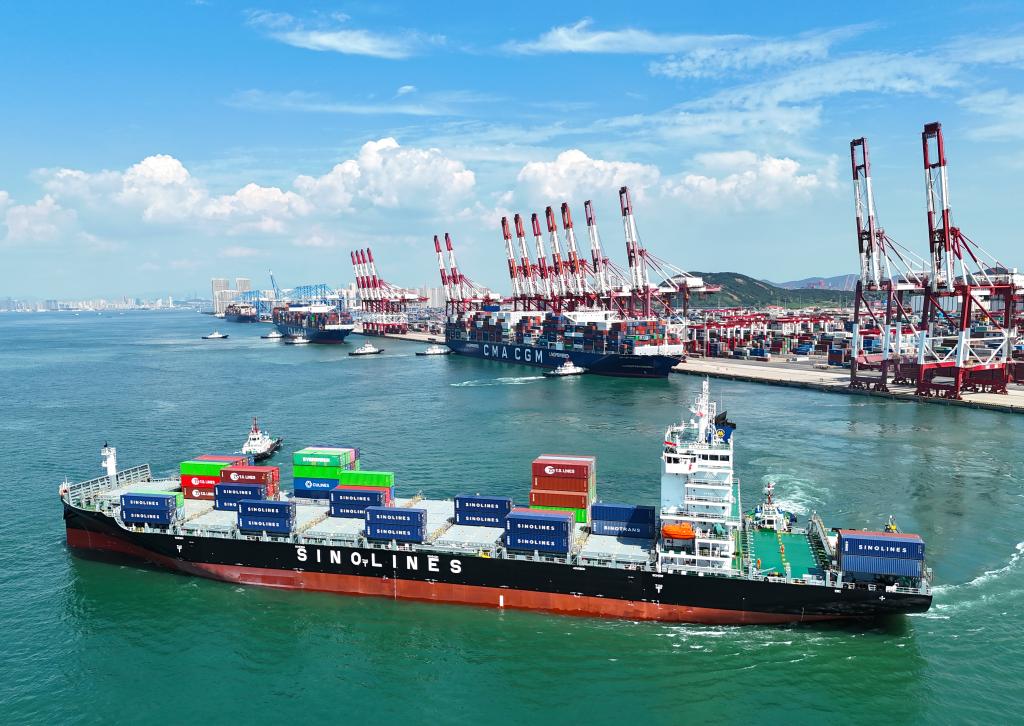 “中外运海口”轮缓缓驶离青岛自贸片区(8月30日摄,无人机照片)。