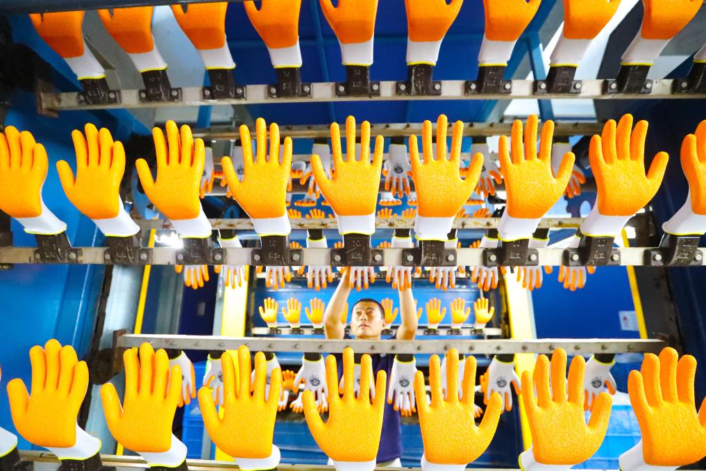 山东省高密市一家劳保企业,工人在生产线上生产劳保手套。该企业通过青岛自贸片区出口,方便快捷(6月17日摄)。