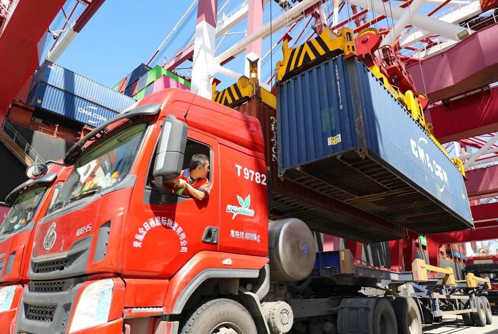 山东自贸试验区青岛片区,集装箱货车司机操控车辆配合货物装载(9月14日摄)。