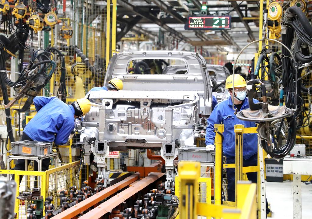上汽通用五菱青岛分公司生产车间,工人在进行焊接作业(1月28日摄)。