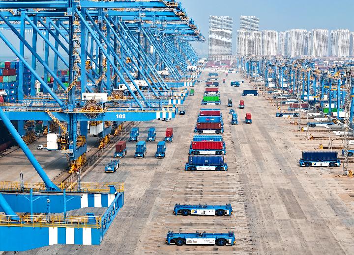 山东自贸试验区青岛片区,无人驾驶的自动导引车在运送货物(9月27日摄)。每一台自动导引车增加了最新算法和功能,系统自动筛选和分析自动导引车所采集的运行数据,用科技手段助力现场设备稳定、高效运行。
