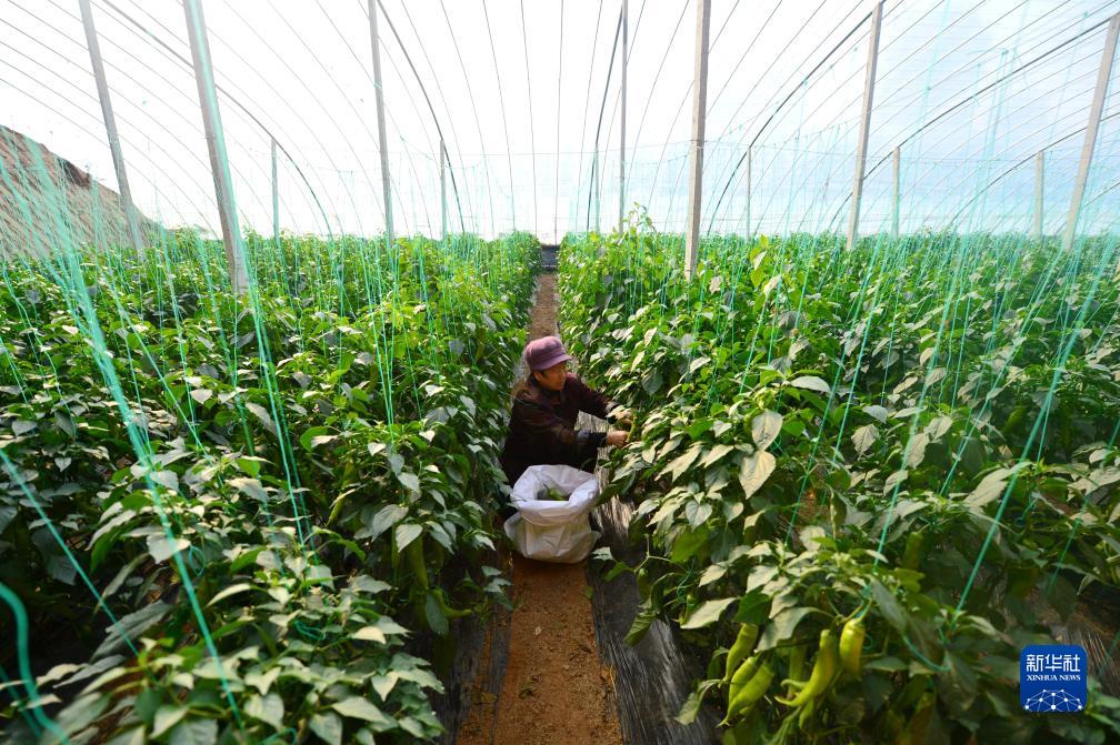 12月18日,石家庄市元氏县南佐村种植户在大棚内采摘辣椒。