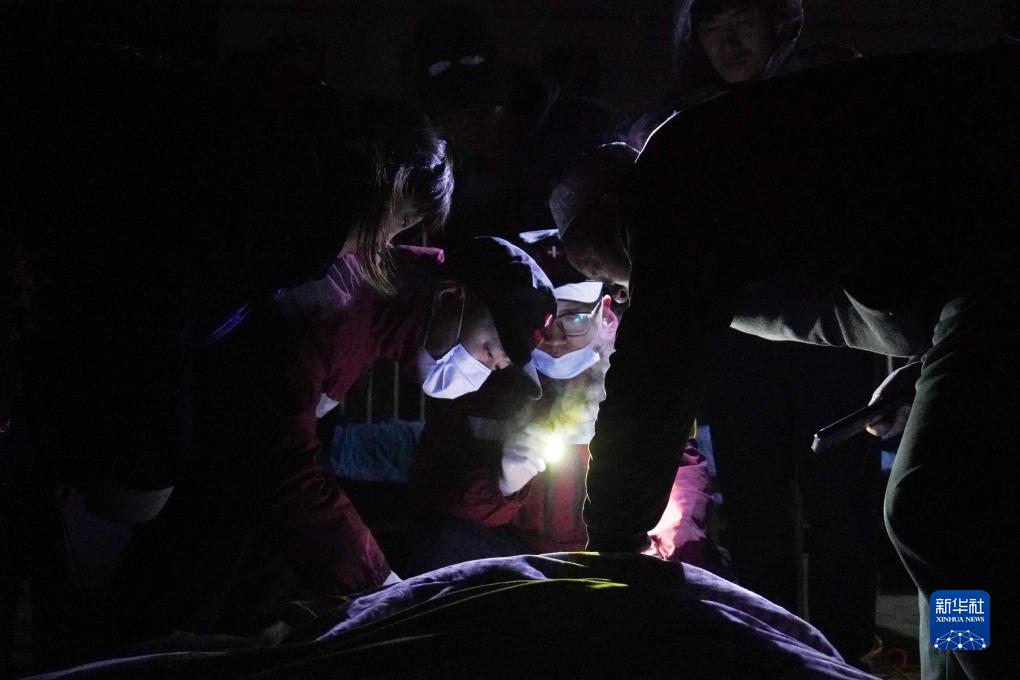 12月19日,在甘肃省临夏回族自治州积石山保安族东乡族撒拉族自治县中西医结合医院门口,医务工作者查看伤者情况。