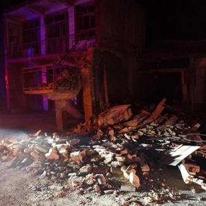 这是12月19日凌晨在甘肃省临夏回族自治州积石山保安族东乡族撒拉族自治县大河家镇陈家村拍摄的一处倒塌的房屋。