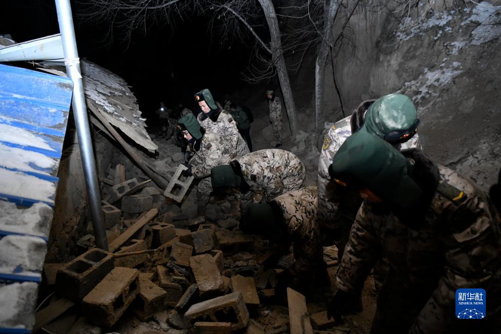 12月19日,武警甘肃总队临夏支队官兵在甘肃省临夏回族自治州积石山县刘集乡阳屲村展开救援。 新华社发(侯崇慧 摄)