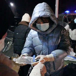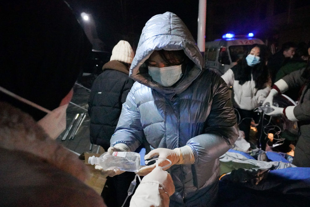 12月19日,在甘肃省临夏回族自治州积石山保安族东乡族撒拉族自治县中西医结合医院门口,医务人员准备医疗物资。新华社记者 马希平 摄