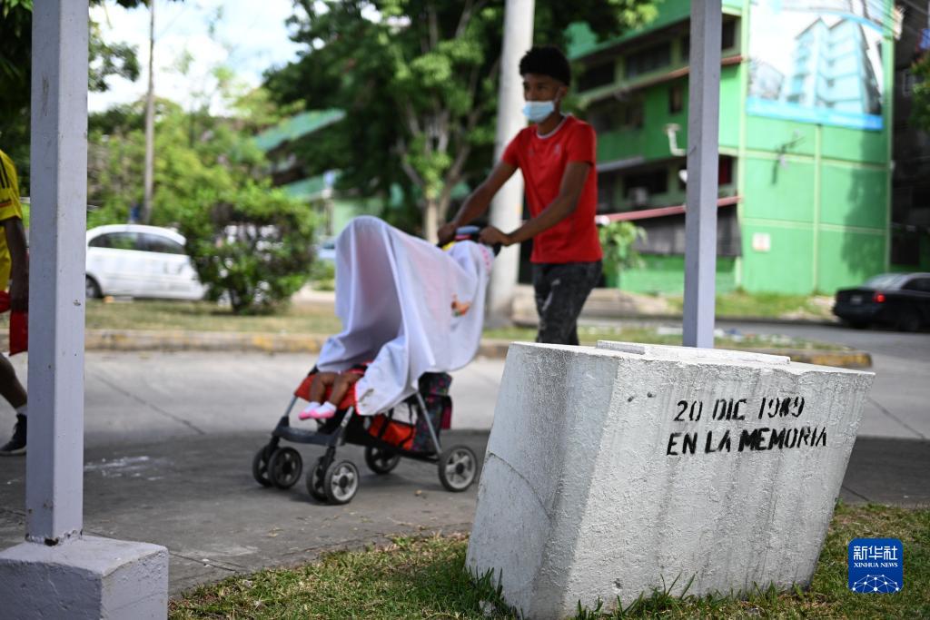 12月15日,在巴拿马首都巴拿马城,一名男子推着婴儿车经过一处纪念石碑,石碑上写着“记住1989年12月20日”。新华社记者 陈昊佺 摄