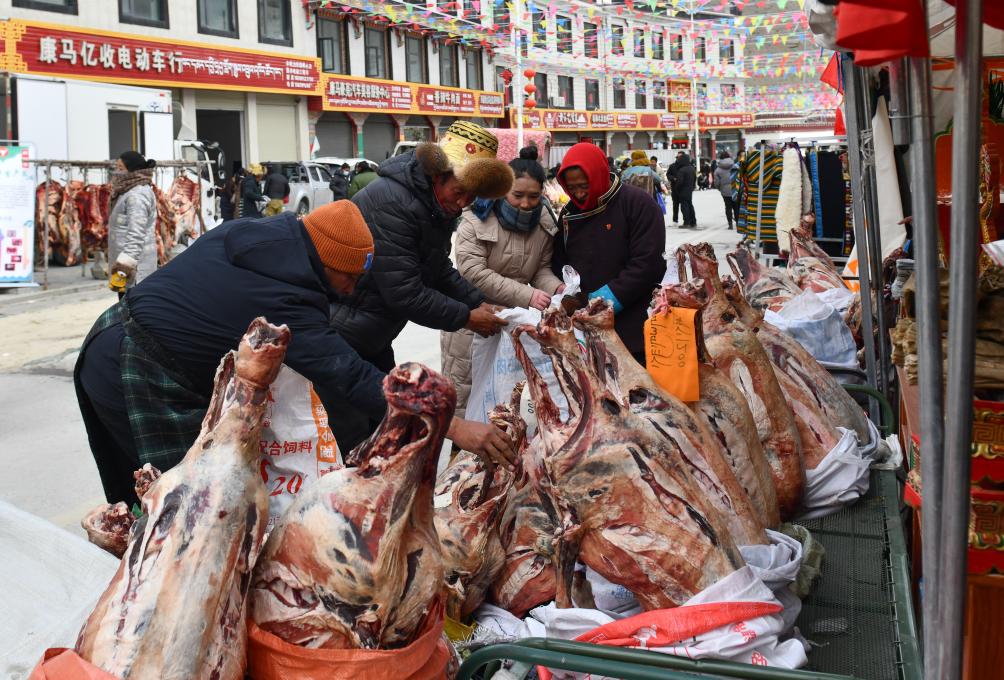 12月13日,在西藏日喀则市康马县冬季物资文化交流会上,当地群众在购买羊肉。新华社记者格桑朗杰 摄