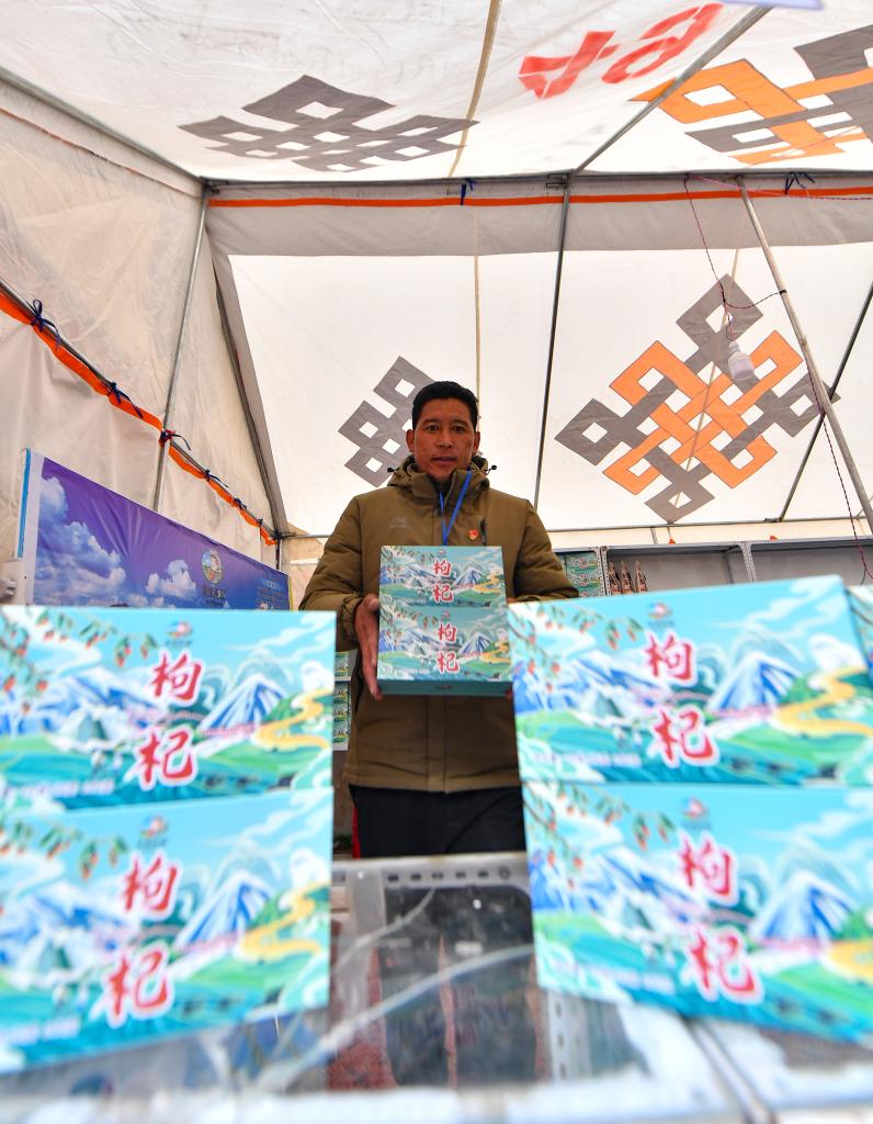 12月13日,在西藏日喀则市康马县冬季物资文化交流会上,涅如麦乡群众展示自产的枸杞。新华社记者晋美多吉 摄