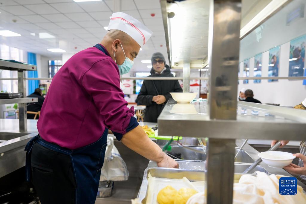 12月19日,工作人员在回民区奔腾社区“为老餐厅”给老年人盛饭。