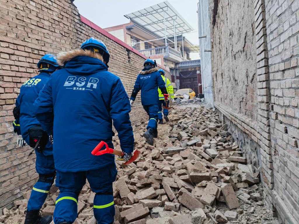 新华社记者跟随救援队员穿过堆积巷中的瓦砾。新华社记者 胡伟杰 摄