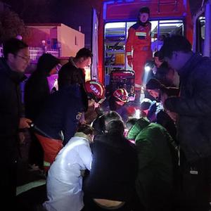 12月19日凌晨3时许,在积石山县大河家镇,临夏县医疗队正在和消防队员一起转运危重伤员。(临夏县医疗队供图)