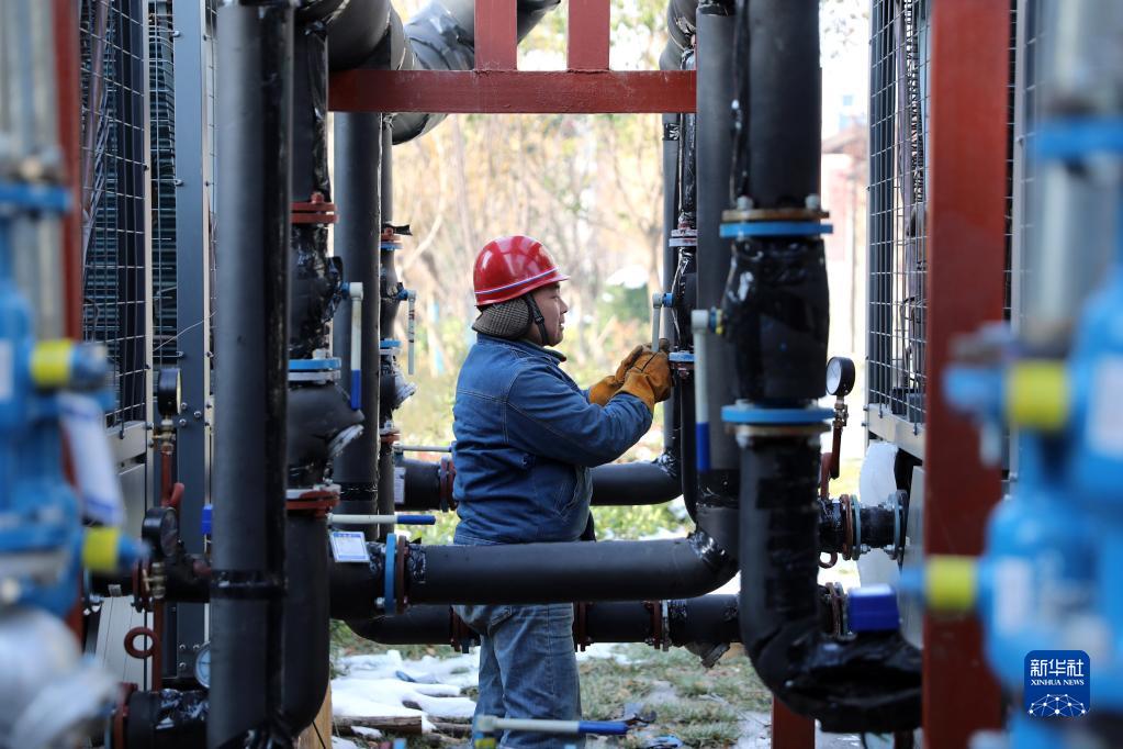 12月19日,热力公司的员工在河南省焦作市温县一居民小区调试热力设备。