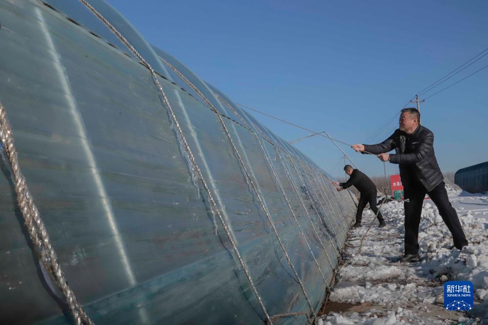 12月19日,河北省遵化市马兰峪镇农民在检查加固大棚。