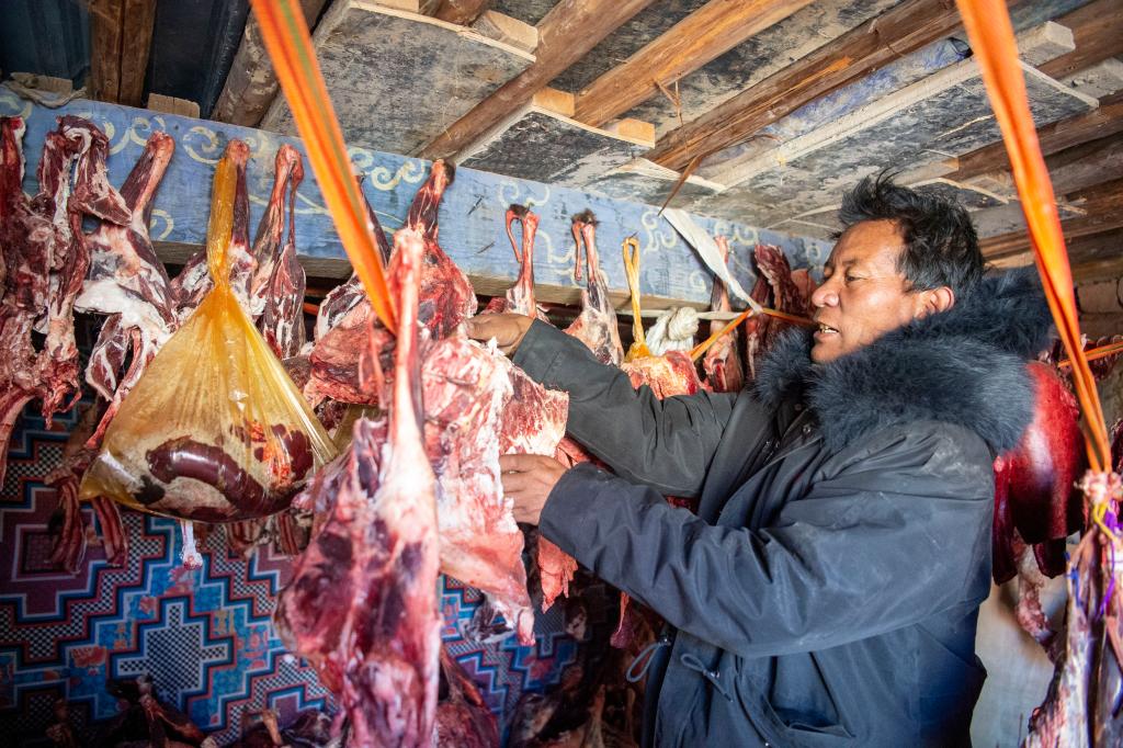 12月18日,嘎玛热杰在家中仓库里检查过冬肉食。新华社记者刘文博 摄