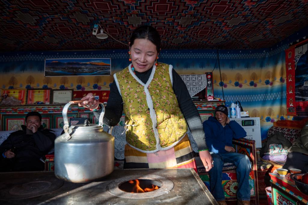 12月18日,嘎宗正在家中的牛粪炉上烧水。新华社记者姜帆 摄