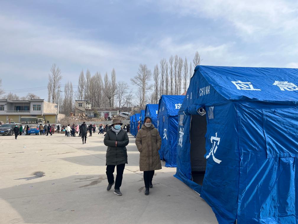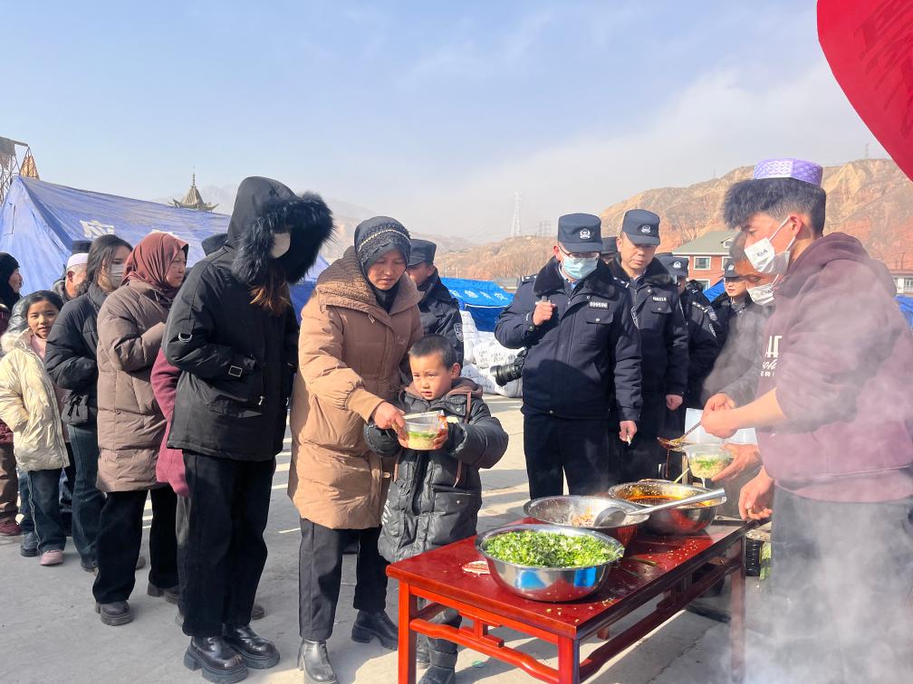 今天,大河家镇的气温始终在零下。车外的广场上,军人、武警、消防、医疗、电力、通信等各方面救援力量不停奔忙,救灾物资不断送至安置点。多方努力下,一顶顶救灾帐篷在广场上快速撑起。爱心人士还在安置点架起锅灶,受灾群众排队吃上了热饭热粥。