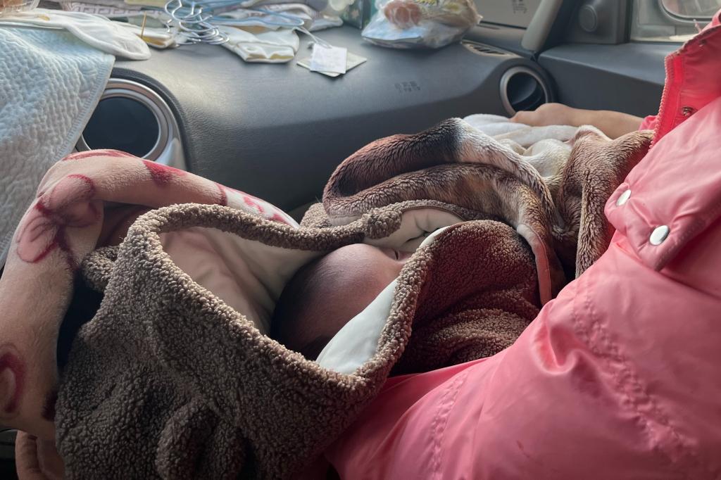 车门打开,暖意涌出,小婴儿正在母亲韩玉秀的怀中酣睡。