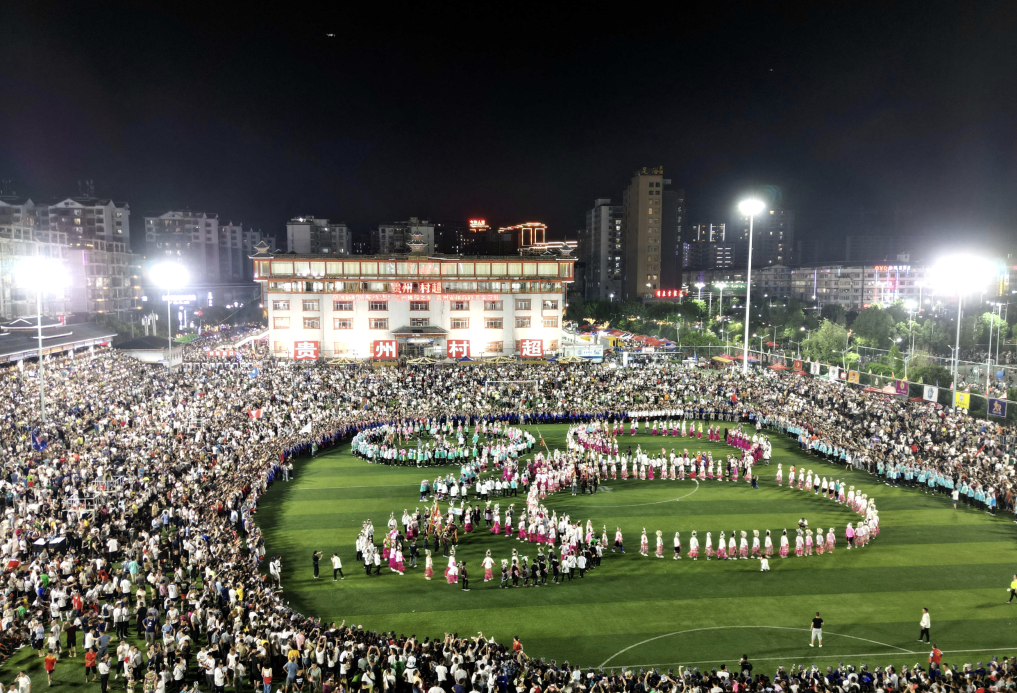 “村超”足球赛比赛现场,瑶族群众在表演舂杵舞