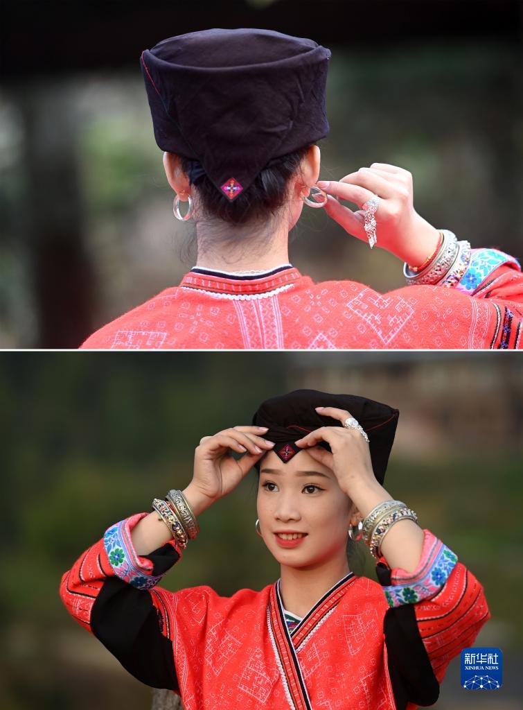 拼版照片:在龙胜各族自治县龙脊镇小寨村,一名女子在展示红瑶服饰(2023年11月29日摄)。