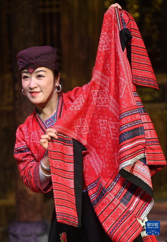 在龙胜各族自治县龙脊镇黄洛瑶寨,村民在文艺演出中展示红瑶服饰(2023年11月30日摄)。