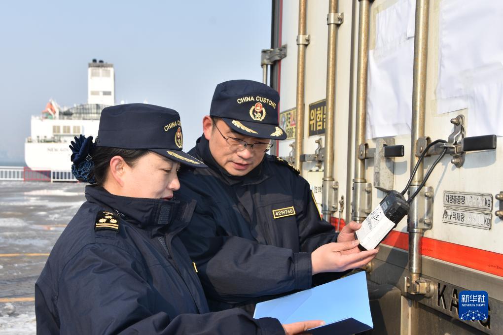 12月19日,中韩两国在威海-仁川试运行多式联运整车运输,首辆承担整车运输任务的货车从韩国抵达山东威海港,接受海关人员检查。