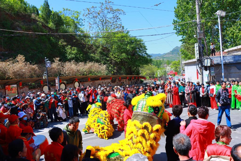 五一期间,淄川区非遗大集在东东峪村举行,开幕式上舞狮表演吸引游客驻足观看。(受访者供图)