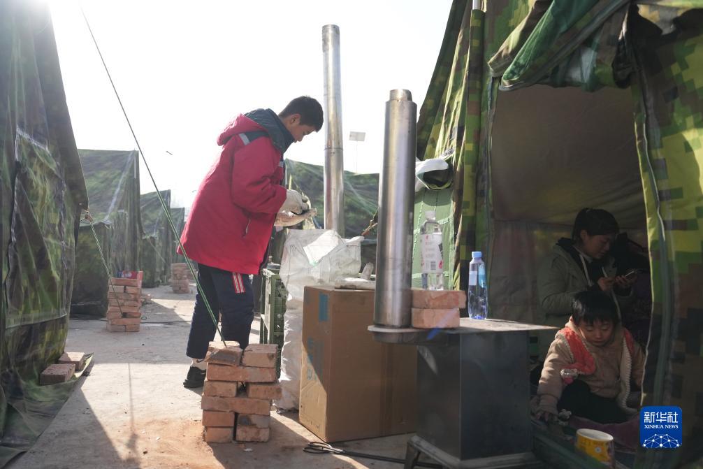 12月20日,在积石山县大河家镇陈家村安置点,受灾群众在帐篷外给炉子添煤。