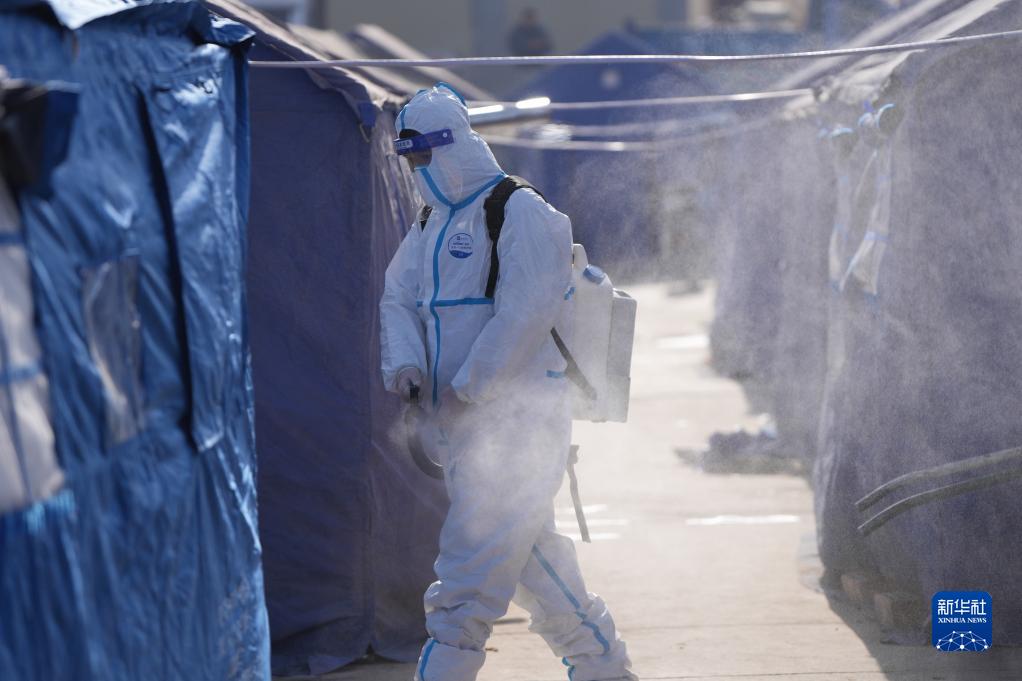 12月20日,在积石山县大河家镇大河村安置点,工作人员在进行防疫消杀。