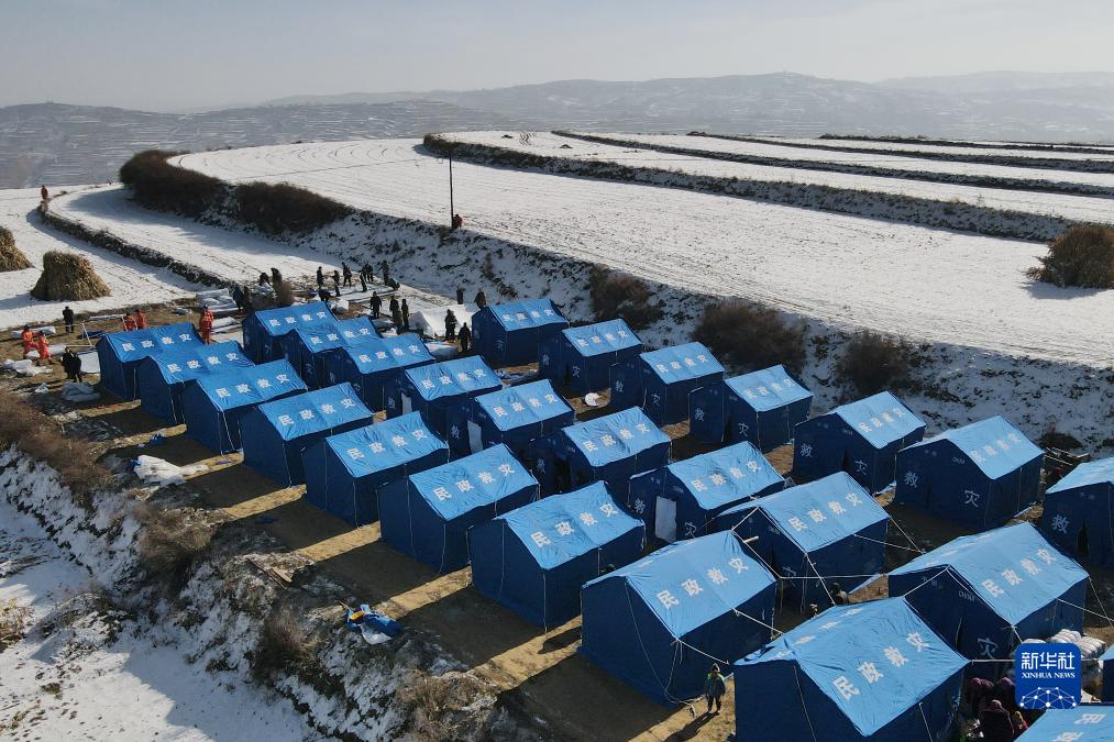 12月20日,在积石山县石塬镇沈家坪村安置点,救灾人员为受灾群众搭建帐篷(无人机照片)。