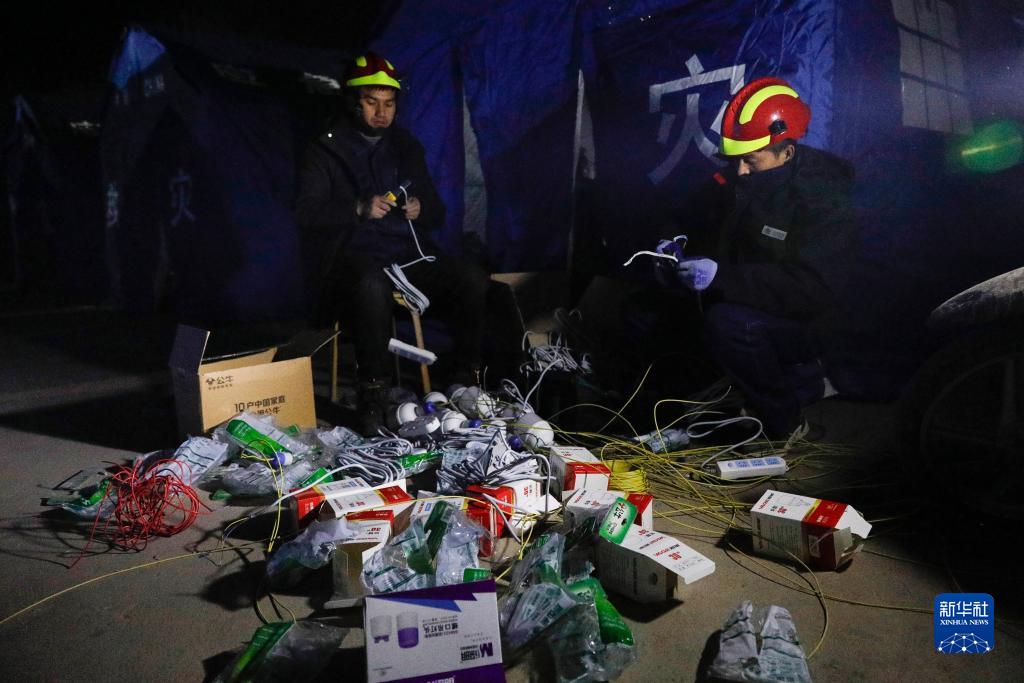12月19日晚,在积石山县大河家镇大河村安置点,国家电网工作人员在做通电前的准备。