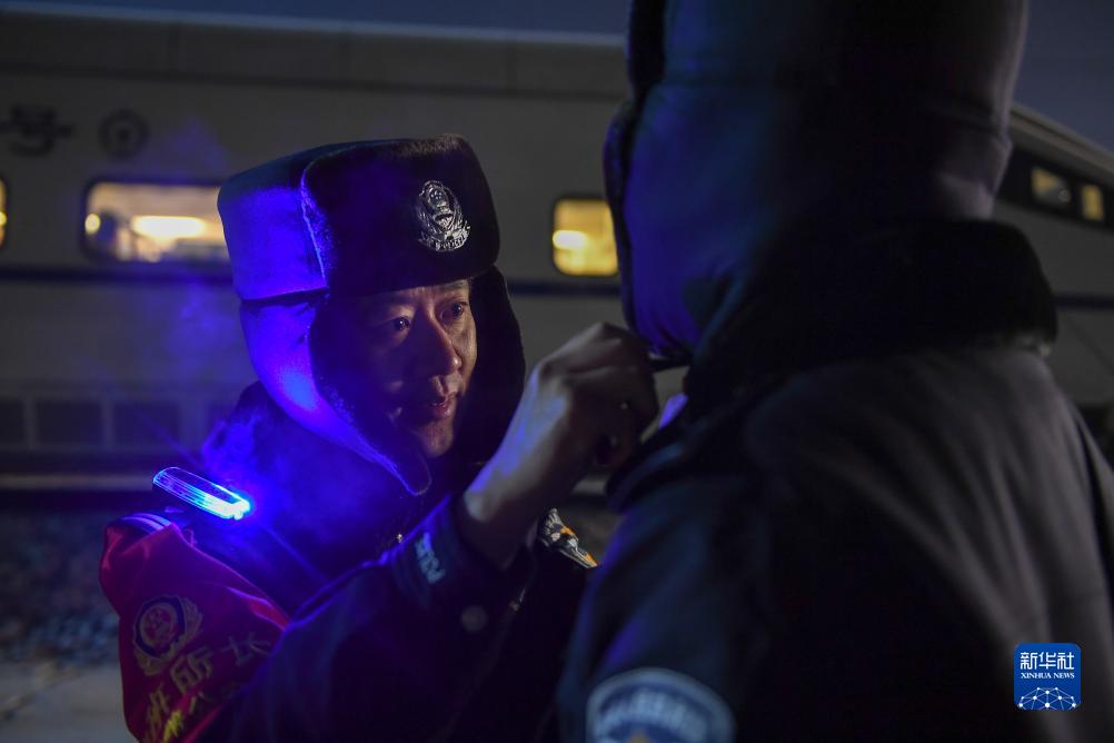 12月19日,在长春动车所,民警王占东为年轻同事系好棉帽。