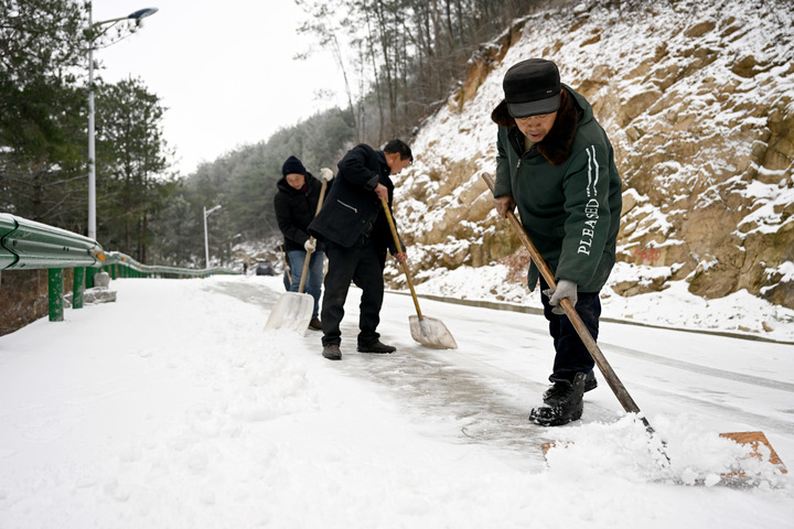 12月19日,安徽省安庆市岳西县天堂镇余安村村民在清理道路积雪。新华社记者黄博涵 摄