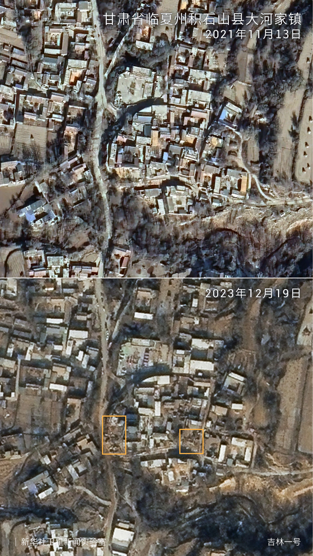 此次受损主要集中在农村地区,位于甘青两省交界处的积石山县大河家镇是受灾最为严重的区域。大河村部分砖块垒砌的院墙被震倒在地或大幅度倾斜,有的房屋外部出现裂缝。强震过后的陈家村一片狼藉,80%以上的房屋已损毁不能入住,部分房屋已经倒塌,砖头、石块等散落到街道上。“吉林一号”星座调用多颗卫星对受灾区域进行了应急拍摄。