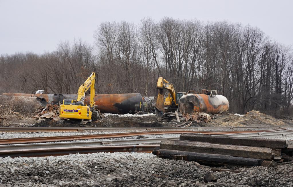 2月14日,在美国俄亥俄州东巴勒斯坦镇,挖掘机在事故现场处理污染土壤。新华社发(章焱飞摄)
