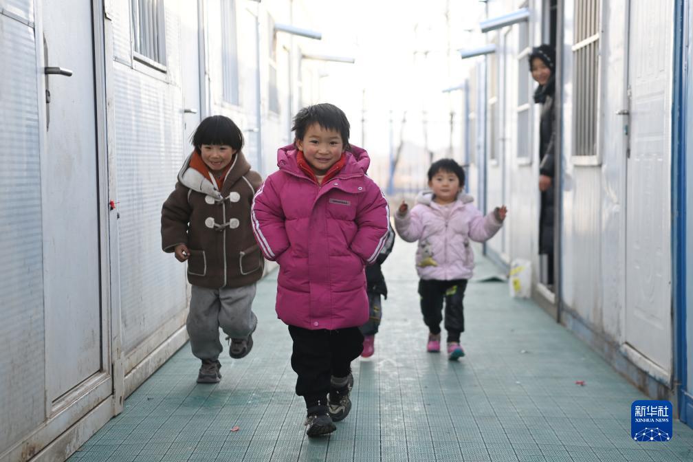 12月21日,在积石山县大河家镇梅坡村活动板房安置点,孩子们在活动板房外玩耍。