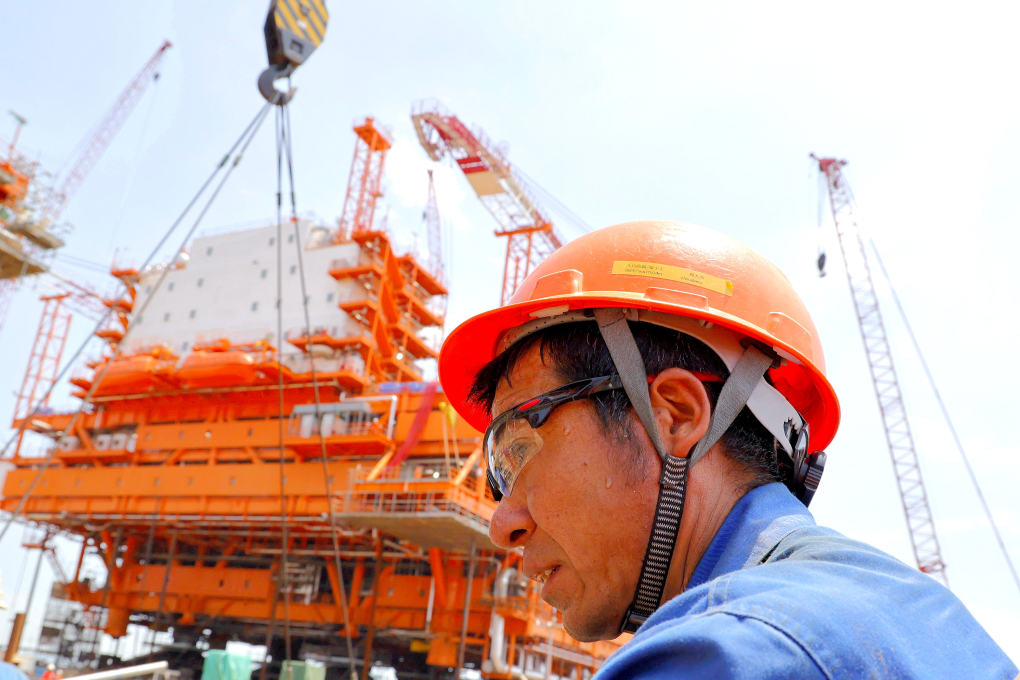 7月9日,工人在渤中19-6气田Ⅰ期项目中心平台作业现场施工,脸上挂满汗珠。