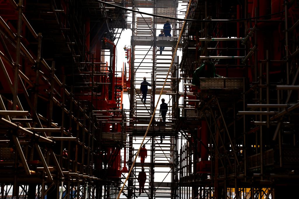 7月6日,工人穿梭在在海油工程天津智能化制造基地建造现场。