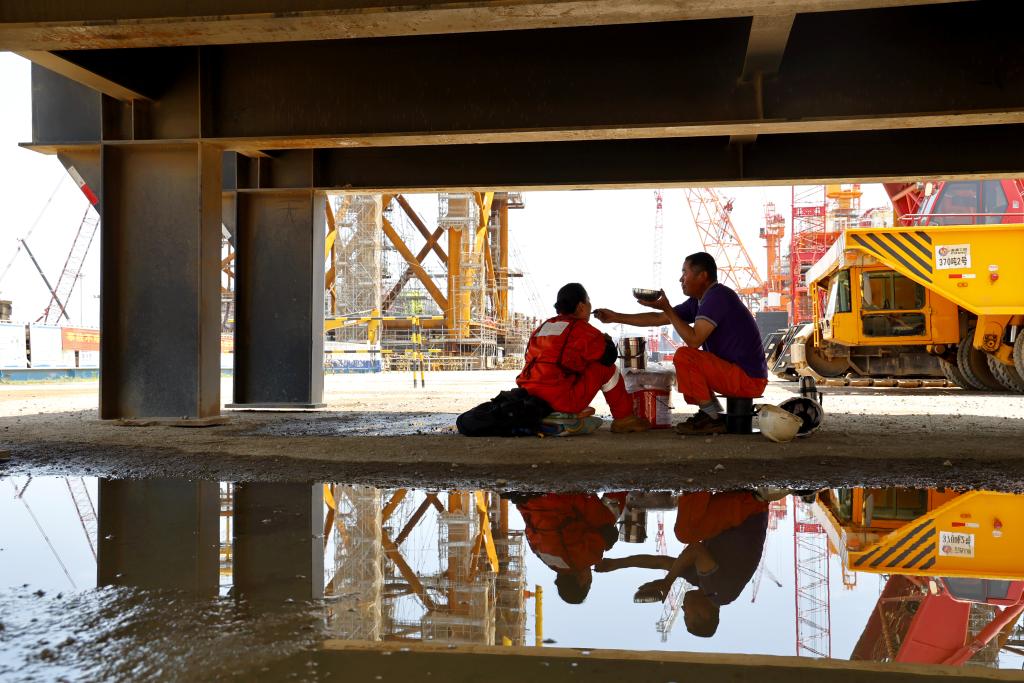 7月9日,渤中19-6组块装船作业现场高温闷热,一名施工人员在休息时喂妻子喝绿豆汤解暑。