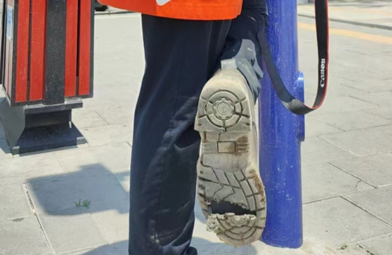 7月10日,在拍摄渤中19-6气田Ⅰ期项目中心平台装船期间,我脚上的鞋子受地面高温影响,磨损开裂。