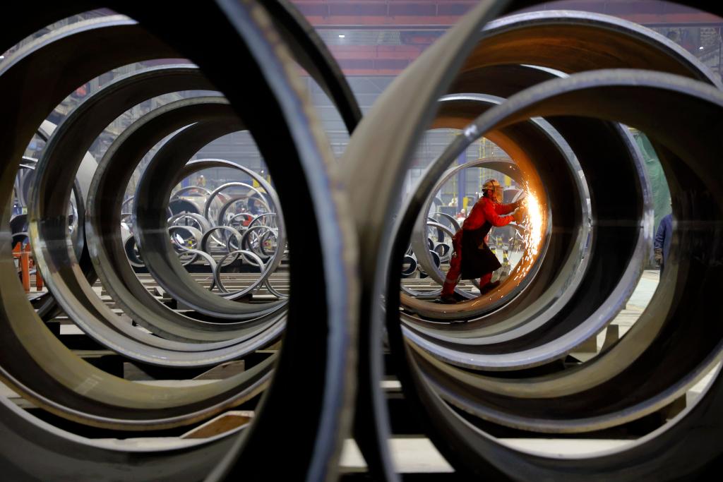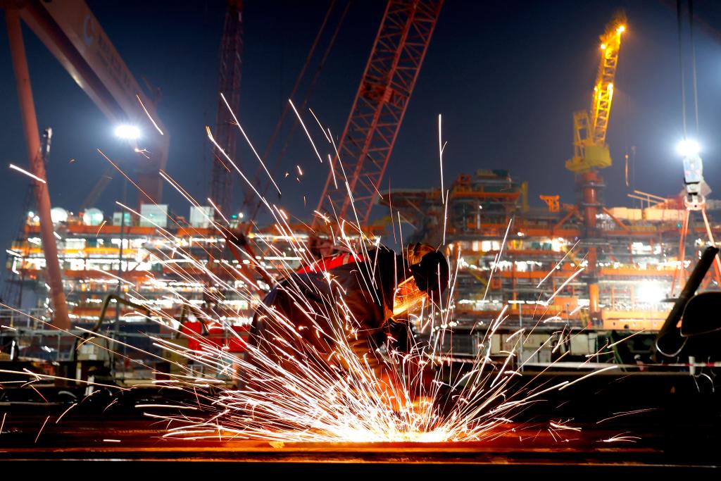 1月13日,在海油工程青岛建造现场,工人对工件进行预制工作。