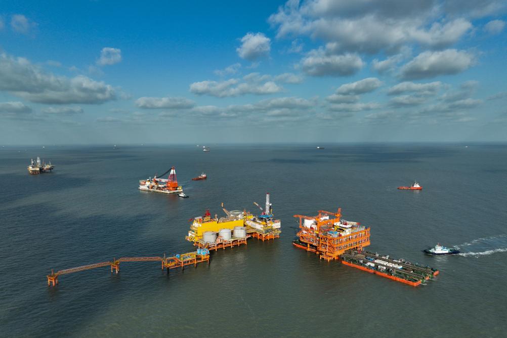 8月15日拍摄的渤中19-6气田Ⅰ期项目海上平台安装现场(无人机照片)。