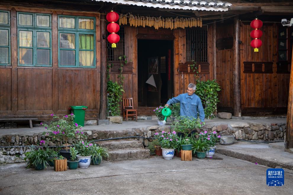 这是湖南省会同县堡子镇黄旗村3组村民唐快生给庭院内的绿植浇水(2022年10月5日摄)。新华社发(张镭摄)